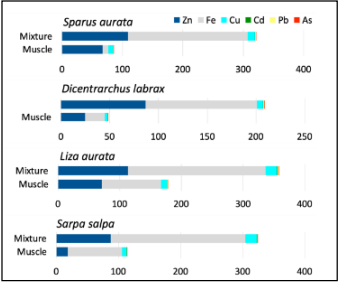 Concentration of heavy metal(oids)(Cd, Pb, As, Fe, Cu, and Zn) in the muscle tissue and the total mixed fish tissues of Liza aurata, Dicentrarchus labrax, Sparus aurata, and Sarpa salpa (Source: nstmbulletin.tn).