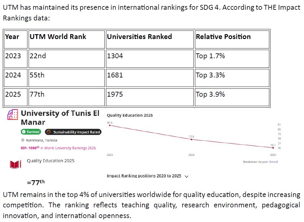 The project improves quality standards in Tunisian higher education while offering a replicable model for French-speaking countries. It strengthens UTM’s influence in the Francophone space through inclusive approaches, North-South university partnerships, joint degrees, and shared accreditation practices, directly supporting SDG 4.