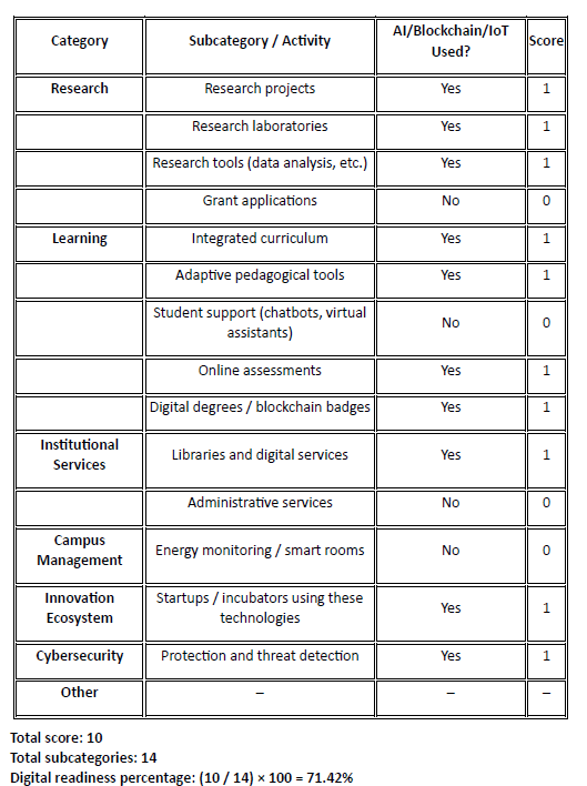 UTM has strengthened its digital infrastructure to support pedagogical and scientific innovation. Internal evaluation reveals that 71.42% of activities and services integrate technologies such as artificial intelligence, blockchain, and the Internet of Things (IoT).